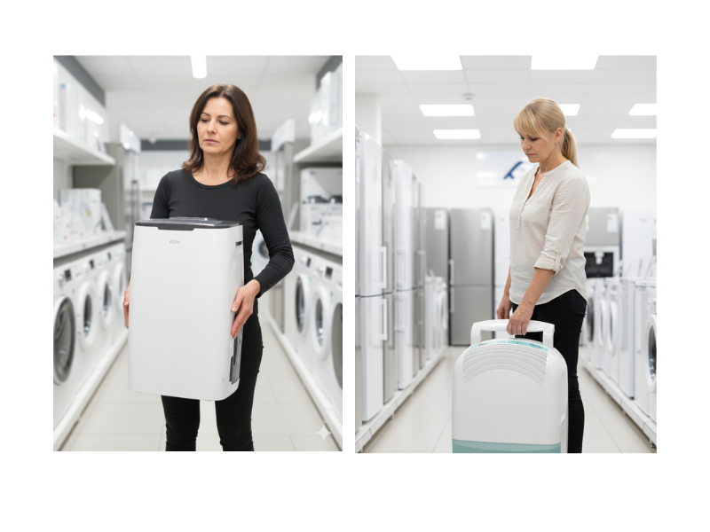 - Poignées et roues - si vous souhaitez transporter l'appareil et monter ou descendre des escaliers, faites attention aux poignées. Certains déshumidificateurs peuvent être soulevés d'une seule main, d'autres doivent être portés à deux mains.